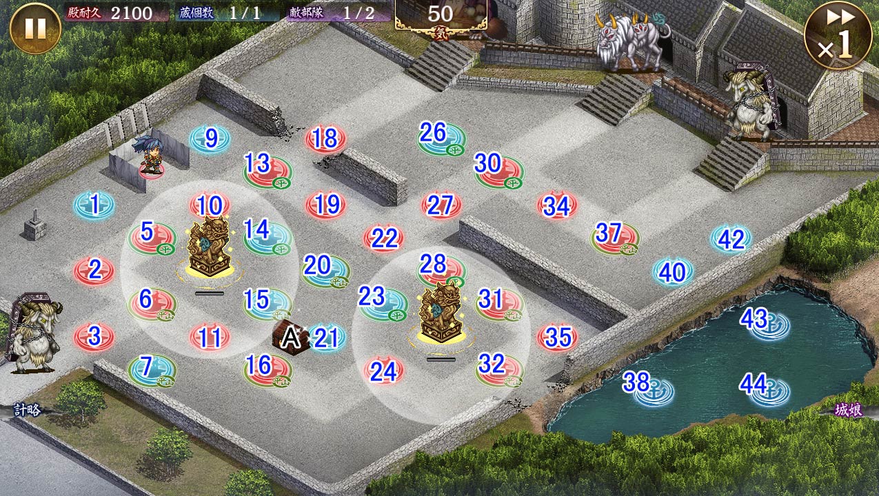 | シーサー像:射程内の沖縄城娘が強化 平、平山の属性強化マスが配置 |
