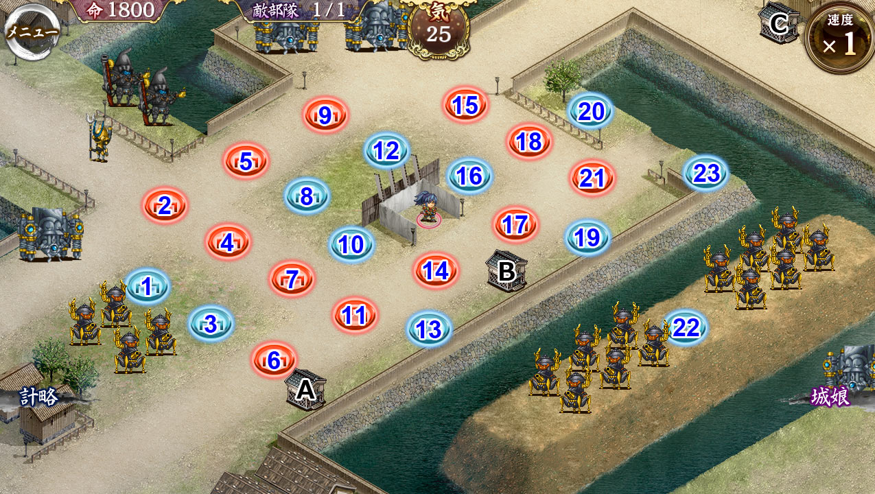 • 難全蔵☆4以下計略不使用の配置編成。12法術を1回巨大化させたら8無双弩を最大化、その後22法術を最大化。長射程の兜が動きだしたら1法術と3弓は撤退させた方が安全。左側の一ノ谷形兜はある程度削っておけば動きだしてからでも倒せます。 -- 2017-05-02 (火) 22:05:21