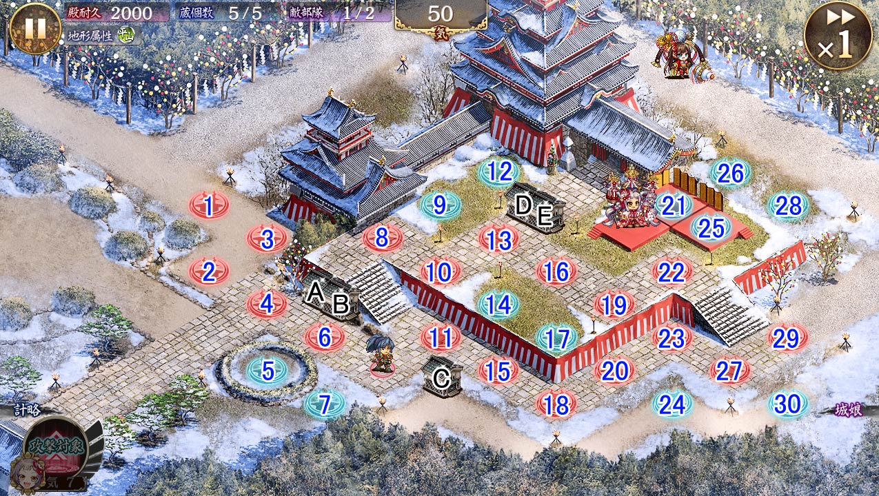 | 今回の合戦の難易度「普通」では、『[正月]徳川伏見城』がお助け城娘として登場しています。 再配置や撤退を行うことはできませんが、巨大化と計略を駆使して勝利を目指しましょう。 |