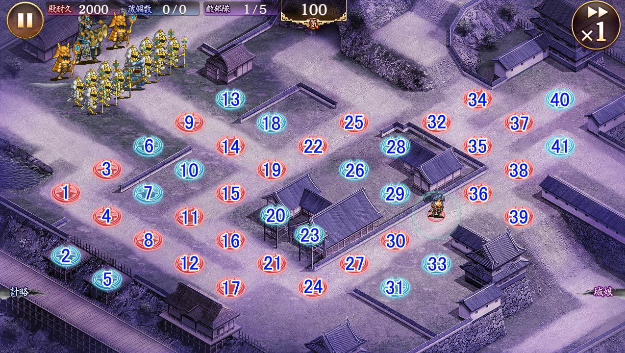 。配置は23浜→20岩→21春→29備→28信→26鶴→19郡→36フ。竜は11,14,17,18あたりにトークン投げまくって凌ぐ。予め殿周りにも置いておく。離間の使い所は1Wの白法術6匹、3Wの金法術2匹、右上から来る赤法術4匹、4Wの竜、5W最後の金法術4匹。 --