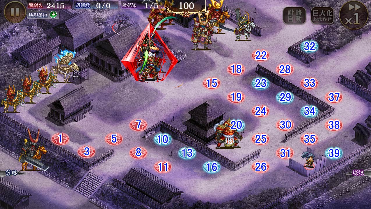 | 2 | 性能増強(超難) | 騎馬兜と妖怪の移動速度変更効果、混乱、猛毒、氷結を無効 城娘が大破した数に応じて回復が500上昇 |