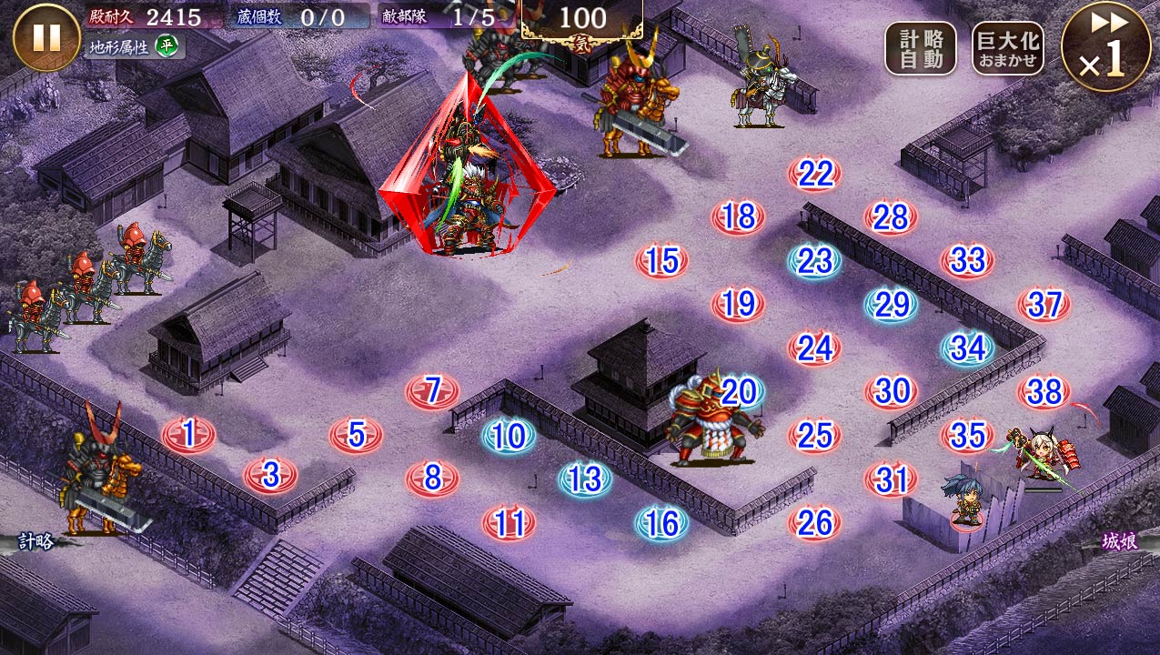 | 2 | 敵味方性能変動 | 大将兜以外の兜と妖怪の攻撃、防御を50%上昇 殿側ユニットの攻撃速度が50%低下 |