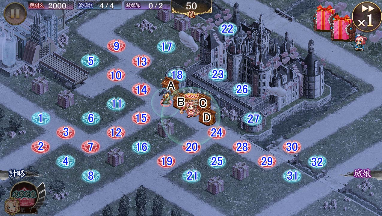 | 今回登場の甘崎城は以下の特技・計略を発動しています。 ・自身の攻撃速度が30%、範囲が85上昇。 攻撃が単発攻撃になり、範囲内の敵全てに防御無視攻撃を行う。 |