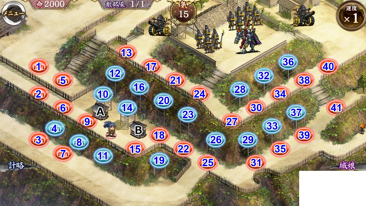Lv25もあれば十分いけると思うけどなあ。このマップ殿周辺にしか配置しないから実際4~6人くらいしか使わない。マップが短いから気力が稼ぎにくく、下手に展開し過ぎると気力が足らなくなる。残った枠のキャラは光秀の鉄砲の的になってもらってヤバくなったら撤退って感じでやれば無駄がない。 --
