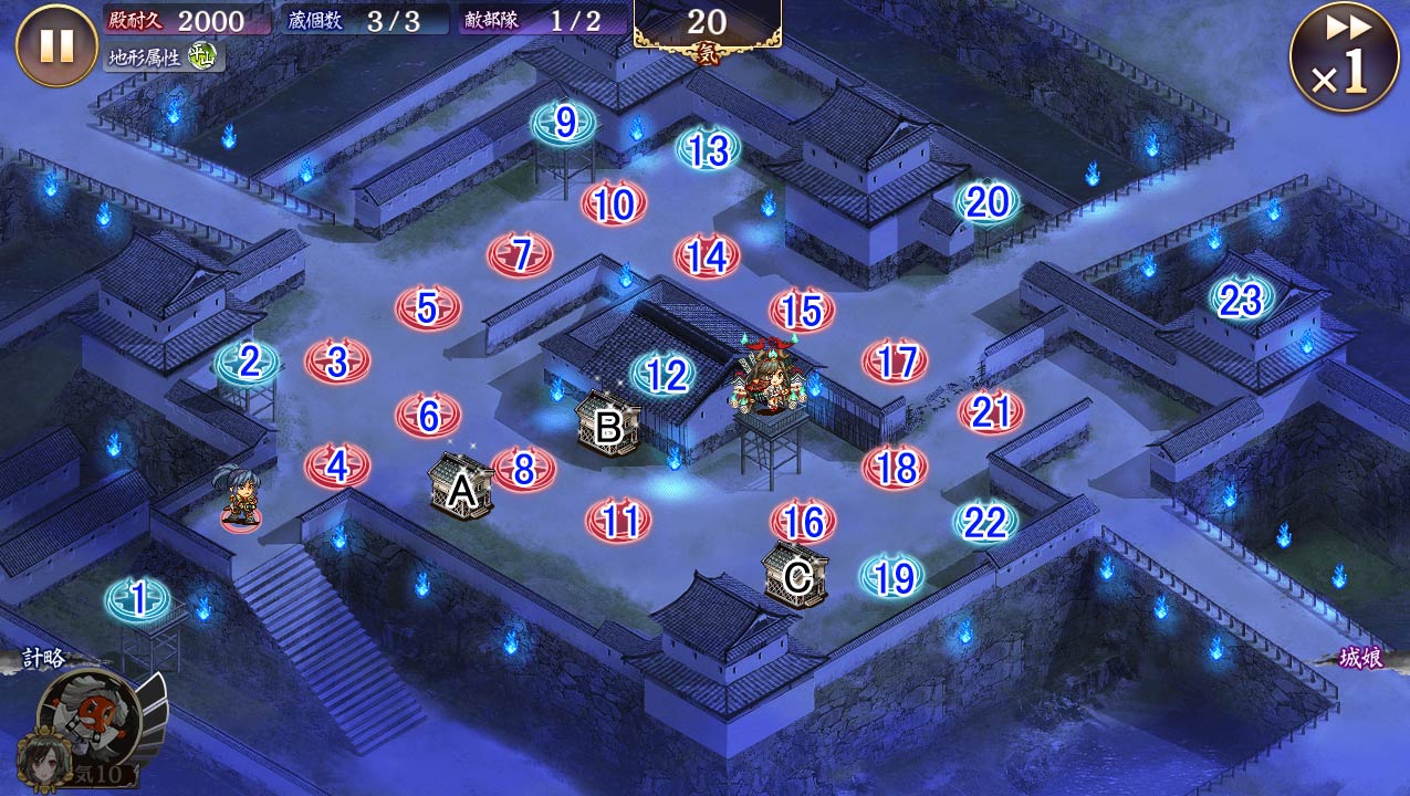 | 今回の合戦の難易度「普通」では、 『[肝試し]鶴ヶ岡城』がお助け城娘として登場しています。 再配置や撤退を行うことはできませんが、巨大化と計略を駆使して勝利を目指しましょう。 |