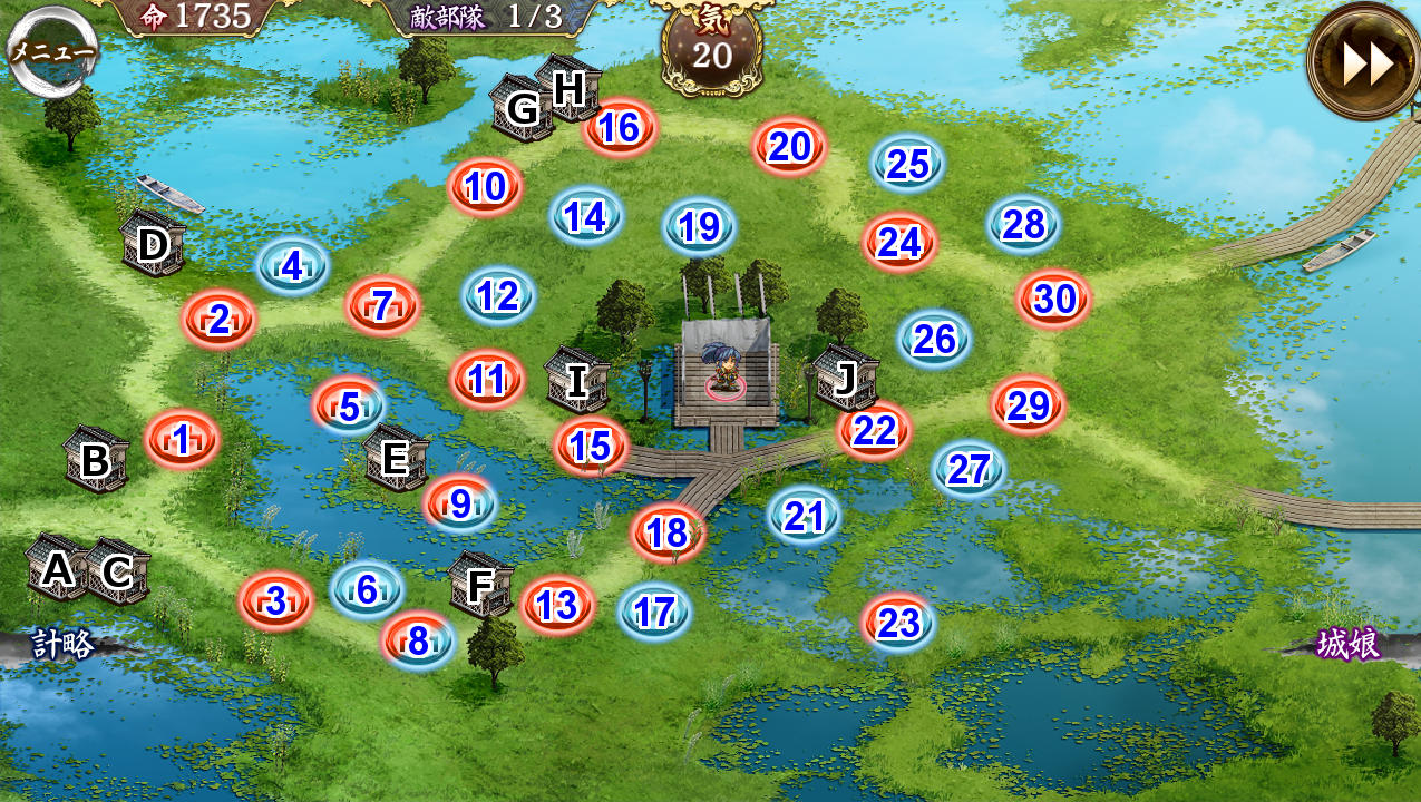 ちなみに配置は大多喜22→稲葉山24→鶴ヶ岡25→三原26→深志12→雑賀27→苗木8→能島17で置いて危なくなったら適宜巨大化(特に防御低下持ちの雑賀と能島、元就初回出現ポイント近くの子は優先)していって、3W目で元就が登場したら木曽川の竜や伏兵を使いまくってダメ与えつつ元就を後退させて最後の方で深志を撤退させ、雑賀を9に再配置したよ。難は…うん、地道なLv上げかウサギが必要そうだな…。 --