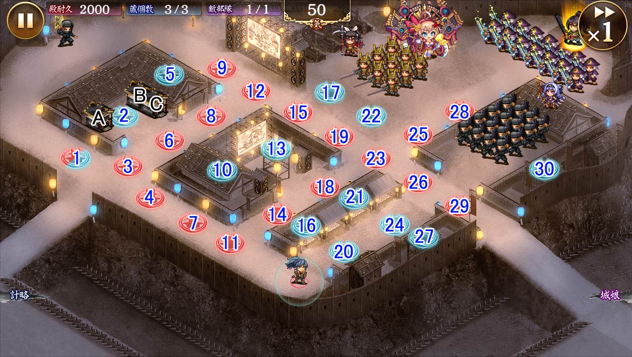 | 小田原城:全ての敵軍ユニットの耐久、防御が25%上昇。 肥前名護屋城:射程内の敵軍ユニットの与ダメージが30%、射程が40、攻撃が200上昇。 ※肥前名護屋城は回復行動を行いません。 |