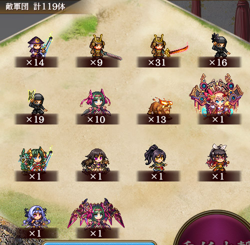| 今回登場の敵城娘たちは、巨大化を行うまで攻撃対象になりません。 また、以下の城娘はそれぞれ特技効果を発動しています。 |