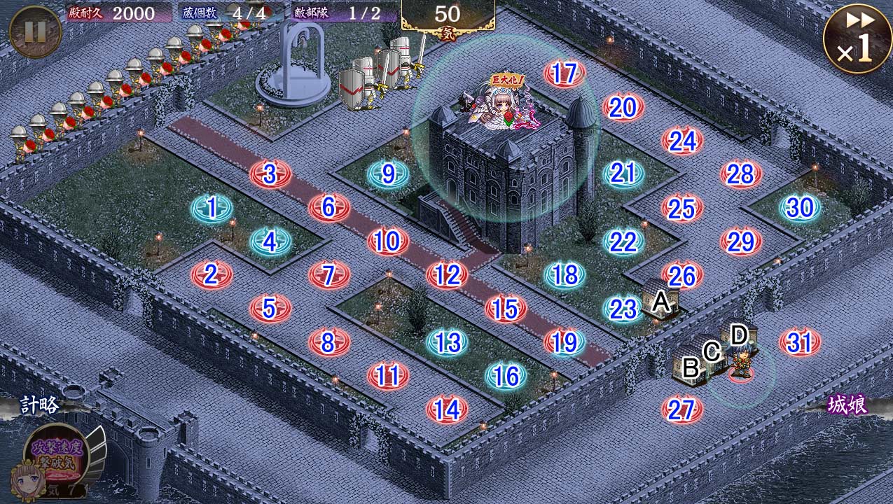 | 今回の合戦では、[花嫁衣装]ロンドン塔がお助け城娘として登場しています。 再配置や撤退を行うことはできませんが、巨大化と計略を駆使して合戦の勝利を目指しましょう。 |