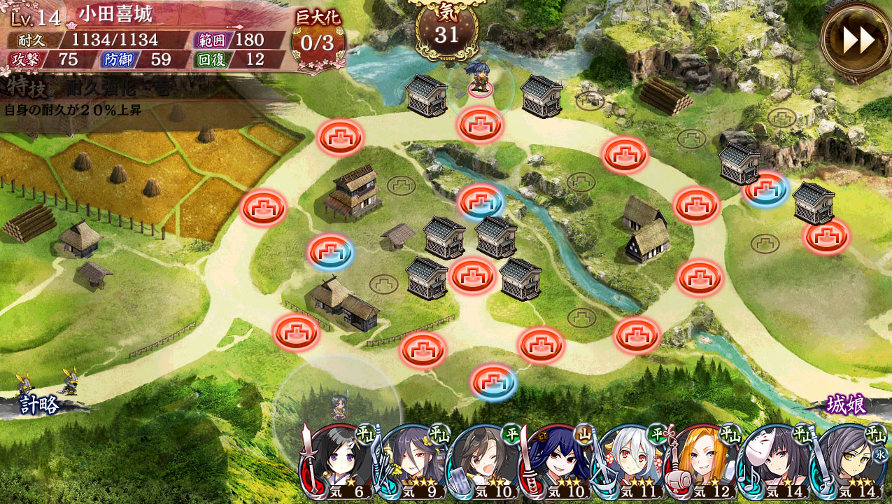 つべの攻略動画を参考にして配布チケ交換の江戸・彦根&低中レア&竜神像ありで委任解放。5彦根改(槍・Lv93)→2八王子改(槍・Lv87)→20高鍋改(本・Lv82)→18秋田改(弓・Lv85)→17備中松山改(銃・Lv81)→15聖夜龍王改(術・Lv86)→12村尾改(弩・Lv86)まで一気置きして、まず八王子を最大化。泥棒の群れが来たら秋田と村尾を上の道に届くまで巨大化しつつ、すり抜けられそうなら高鍋計略で鈍足化し、19に江戸(刀・Lv96)。泥棒の次の飛行の群れに合わせて秋田最大化し、鍬の群れが下道に迫ってくるので江戸計略点火して巨大化させつつ、落とされない程度に彦根を段階的に巨大化。気トークンの置忘れが無ければここまでギリギリやり繰りできる筈、牛は1→21→23の順で置き、21は足止め囮も兼ねるので壊されたら都度置きなおし。あとは気が溜まる毎に残りを都度巨大化させ、相撲が湧いたら江戸計略。最終ウェーブの蝙蝠の群れに槍二人が削られるので村尾計略を削られてる方の槍に使って耐える。ボス飛行は高鍋と聖夜龍王の計略で足止めしつつ削り、敵が村尾に届くあたりで江戸計略点火。槍二人のレベルをしっかり上げないと最後の蝙蝠に削り殺された。軸の江戸彦根以外は、似た計略持ちでも代替できると思う。 --
