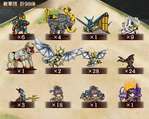 | 今回登場の敵城娘は以下の特技・計略効果を発動しています。 平井城: 自身の射程が20上昇、攻撃速度が1.5倍、攻撃を受けた時、攻撃の45%で反撃。 自身の射程内の敵軍ユニットの射程が50上昇。 飯沼城: 自身と分身の攻撃が17%上昇。 玉縄城: 全ての敵城娘と飯沼城の分身の被ダメージが25%軽減、攻撃後の隙が25%短縮。 ※玉縄城は合戦に参加せず、攻撃や回復行動をおこないません。 また、その他の敵が全て撃破されると、合戦勝利になります。 |