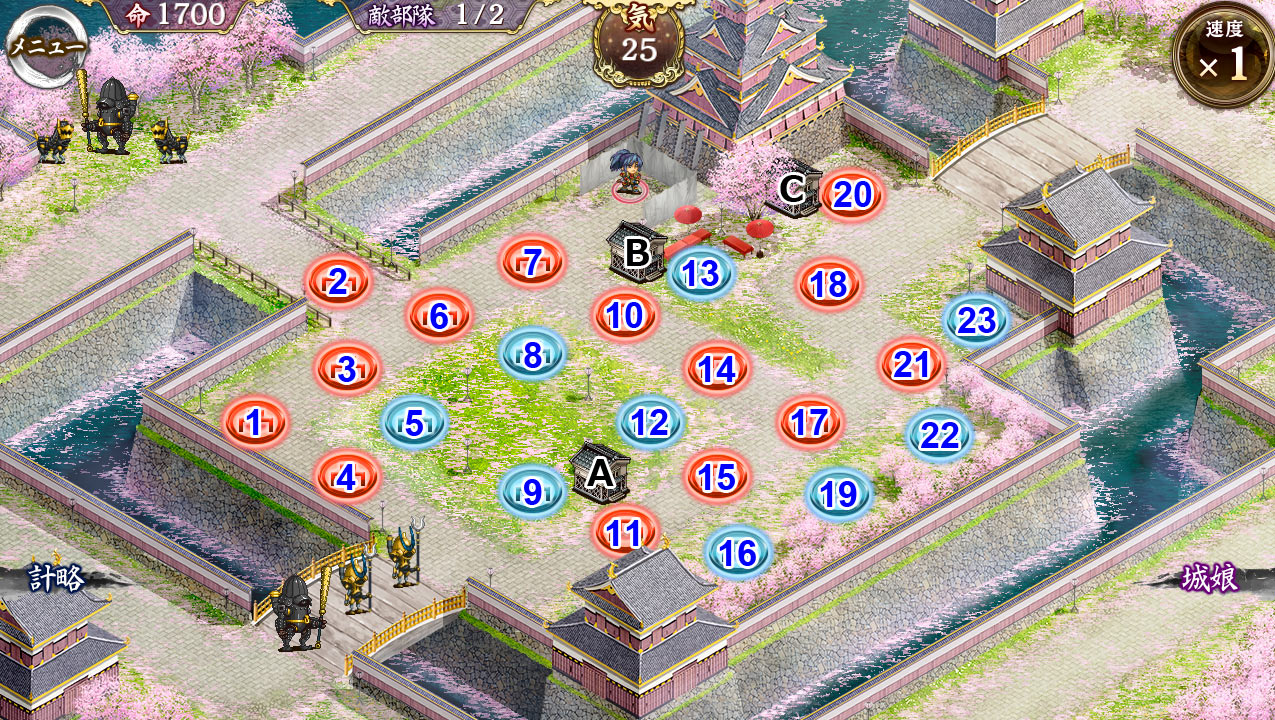 • 5、11、23、20、8、7に有効そうな城娘を置いたら、あとは彦根に気をつければ良い感じ。9だけではなく、12も巻き込まれるので注意。15~14の通路に一人置いておくと保険になる。 -- 2020-10-29 (木) 15:14:55