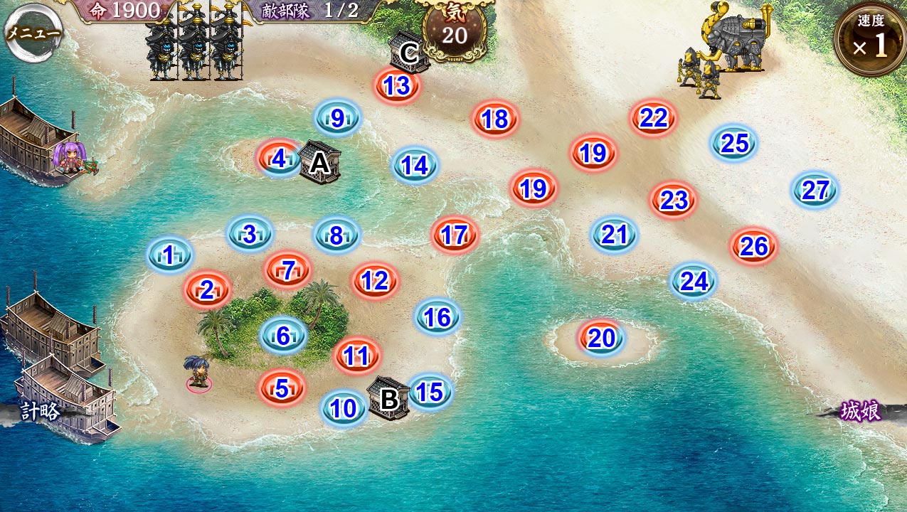 • 一応ですが、自分なりで難クリアーの方法を。⑰にサンタンジェロ(盾)LV68。⑭に柳川・改壱LV63(石弓&気合いトークン持ち)。⑬に鹿野(槍&気合いトークン持ち)LV55。④へ板島丸串(大砲)LV61。⑯に宇土(鉄砲&回復持ち)LV62。⑪に岩国(刀&回復持ち)①or③に高知(鉄砲)LV68。⑧に鶴ヶ岡・改壱(歌舞伎)LV64。そして、⑨と⑥に気合いトークンを置く。障壁は、まずB蔵にかける。⑯と⑪は優先的に巨大化させて行く(2~3段階くらい)。上陸しようとする兜は、この2体に任せる。④の大砲は1回巨大化しておけば、対岸のザコを掃討してくれる。⑧に歌舞伎を置けば、ほぼ全員に回復が届く。2波に入ったら、気トークンをすぐに設置し直す。⑨のは、壊されたら設置し直し。⑬の鹿野は、しばしば巨大化させて回復する。以後は適当に巨大化させながら様子を見る。自分的には、ほとんどレベルでゴリ押ししているだけだけど、何かの役に立てば。 -- 2017-10-27 (金) 06:42:37