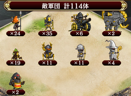 良い布陣のアドバイスありがとう。ちょっと工夫して、1弓 7弓 17大砲 25槍 26杖 23刀 27槌 2歌舞。25槍が象を倒したら、29へ。平均LV60で高レア並べたから、危なげなく難クリア。SUMOUより、布陣が薄い右翼に来る西洋兜の方がウザかった。 --