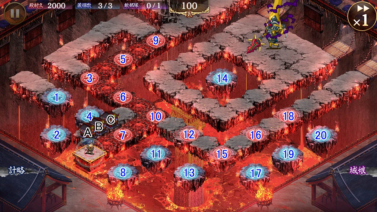 • 十七審議。配置。初手唐沢山最大化で、鞭が無力化する。間に合わないときはプレヤマ挟んで。その後絢爛アラゴ巨大化しつつ、そこまで都於郡を届かせる。都於郡計略は序盤ポエナリ。9でプレヤマ大破させつつ、適当なところで15へ。プレヤマの回復が間に合わないときは、19にトークン。2回もやれば、だいたい削り切れるはず。あとは全計略着火して、鉢ヶ峯でも巨大化させつつ適当に流してクリア。 -- 2023-08-07 (月) 06:15:51