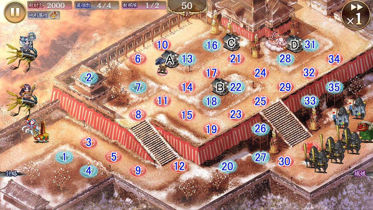 右下から相撲軍団と熊手を持った兜、左から飛行軍団と祓串、それと敵城娘。序盤終盤は右下からの雑魚がメインだけど中盤あたりに左から大軍勢が押し寄せて来るからそこの物量に注意 --