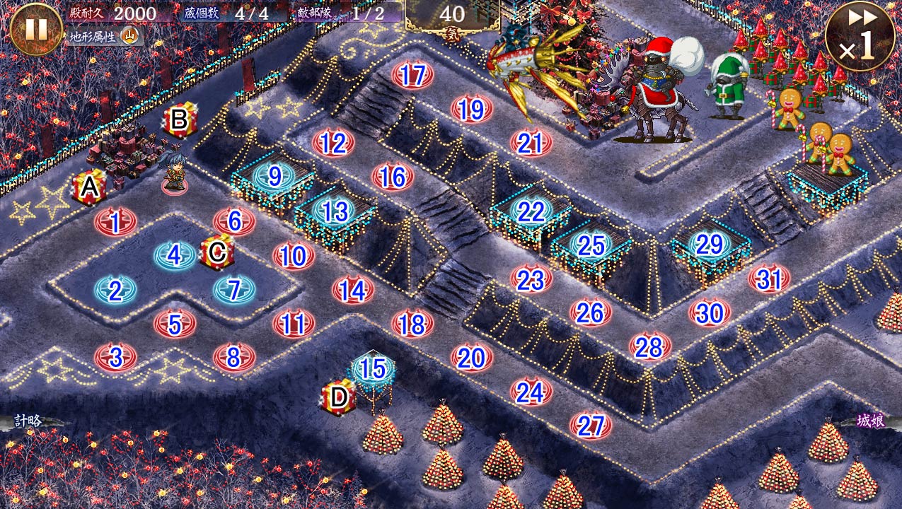 | 大ヘラジカ形兜に乗ったサンタ金剛力士形兜は、耐久が半分以下になると進軍を開始し、 移動速度が上昇します。また、足止め数が3未満の場合、足止めできません。 また、攻撃を5回受ける度に移動速度が1%低下します(最大50%) |