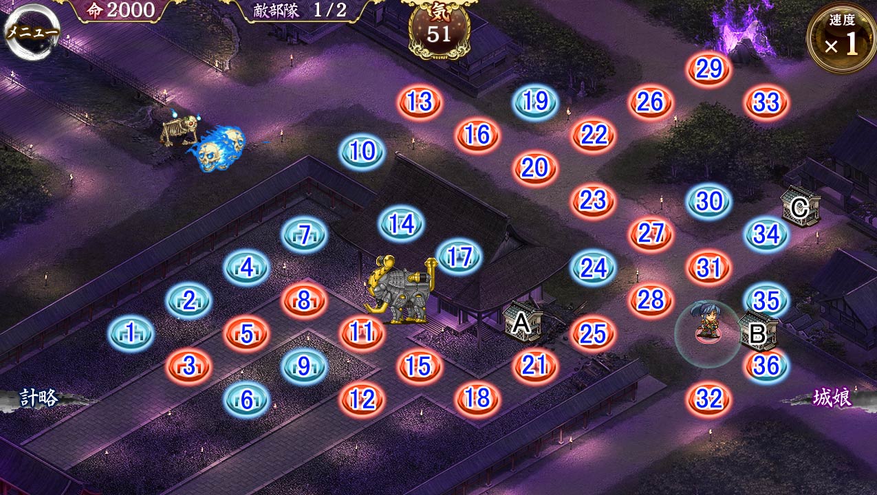 14宇都宮城、17山科本願寺、24柳川城、15邯鄲、19徳丹城、16カーナーヴォン城、35大宝寺城、36那古野城(全員改壱)で☆4改以下クリア 最後左下から髑髏が2体来るところで柳川撤退→大宝寺城を9に、カーナーヴォンで止めてる髑髏をある程度削ったら徳丹を35に再配置。 カナボンと徳丹の計略で足止め近接に耐えてもらった。 --