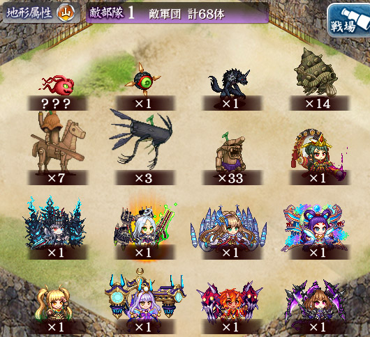 | また、今回登場の敵軍ユニットは以下の特技効果を発動しています。 閻魔庁: 射程内の殿側ユニットの攻撃を20%、防御を25%低下。 閻魔庁の伏兵『司録神』は倒されるまで一部の敵を登場させ続けます。 エーリューズニル: 自身と自身の伏兵『ガルム』の攻撃と攻撃速度を25%上昇。 ガルム: 攻撃対象の防御を20%無視し、攻撃時に与えたダメージの20%を回復。 バベルの塔: 自身の与えるダメージと爆風範囲が30%上昇 また、射程内の敵軍ユニットの城娘の攻撃を100増加。 ラピュータ: 自身の攻撃が1.7倍上昇、射程内の殿側ユニットの被ダメージが30%増加。 さらに、飛行状態では攻撃対象になりません。 |