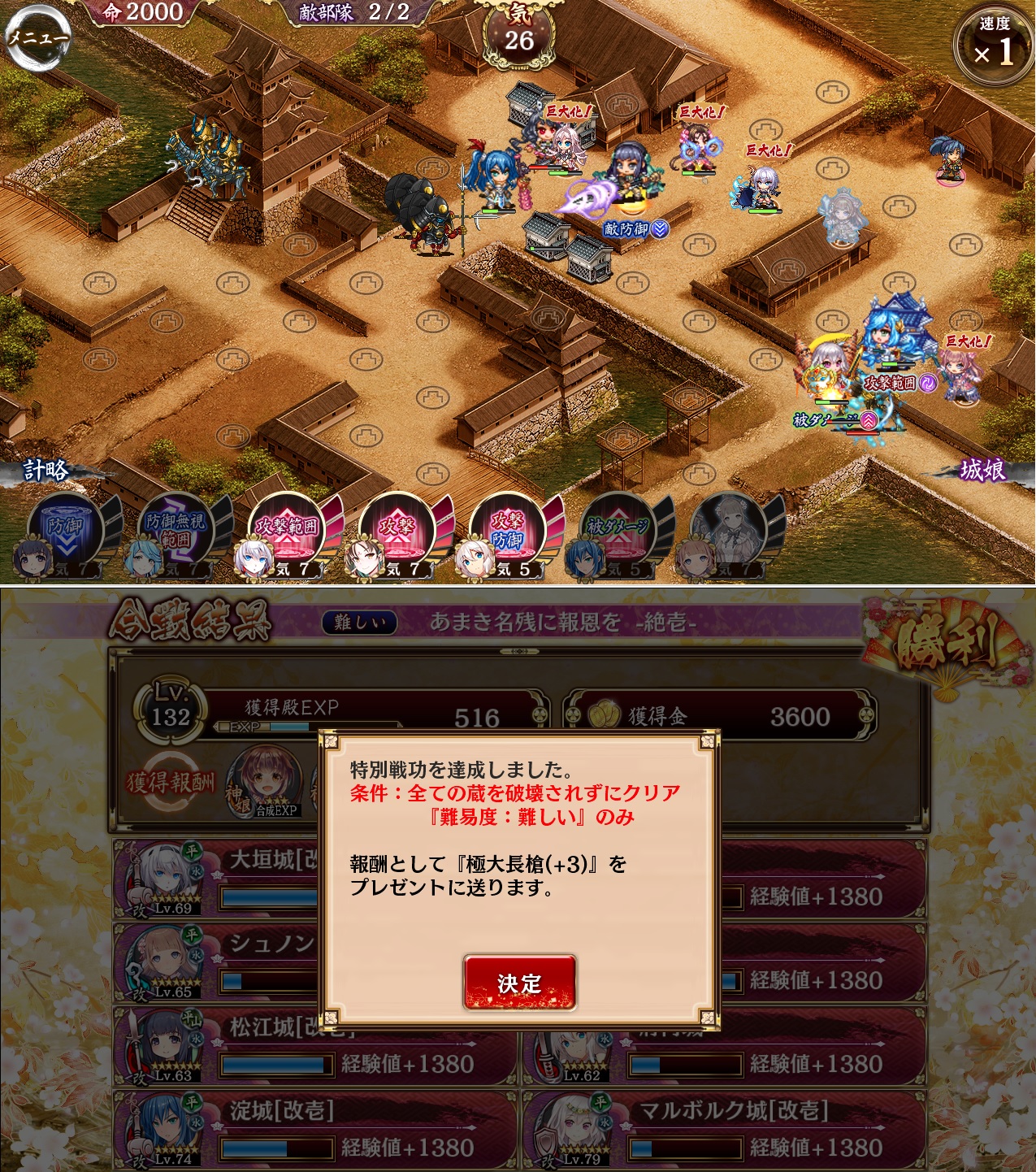 ヘラジカの火力も体力も高いし、黒母衣兜も強いし、小牧山城をすぐに倒せないのも辛い。特に右下は激戦区なので、盾でブロックしながら歌舞で回復させつつ、杖でさっさと削りたい。それと、岩手山城はリーチが非常に長いので蔵の前でブロックしようとすると蔵が破壊されるので注意。 --