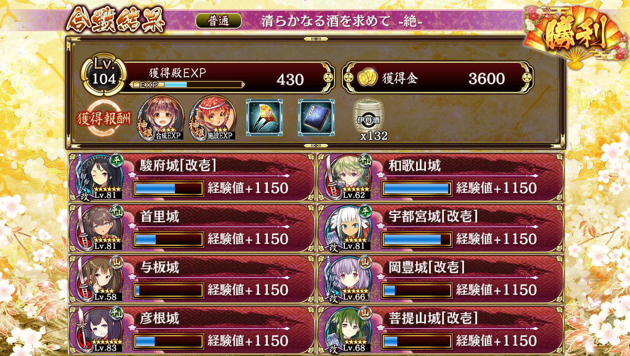 ん~・・・今回も山形・忍に拘って嵌って同Lv帯の与板・苗木にして1発全蔵って結構テンション下がるな。折角地形ごとに育成してるのに・・・。 --