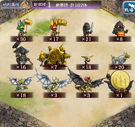 ラピュータ主軸って所を見本に使い慣れた娘たち組んだら何とかなった。巨大化はラピュータとリヒテン優先、間諜兜の第二波に岩殿山の離間、鷹は正月一乗谷任せ、終盤の力士は攻撃2倍のアンベールで。