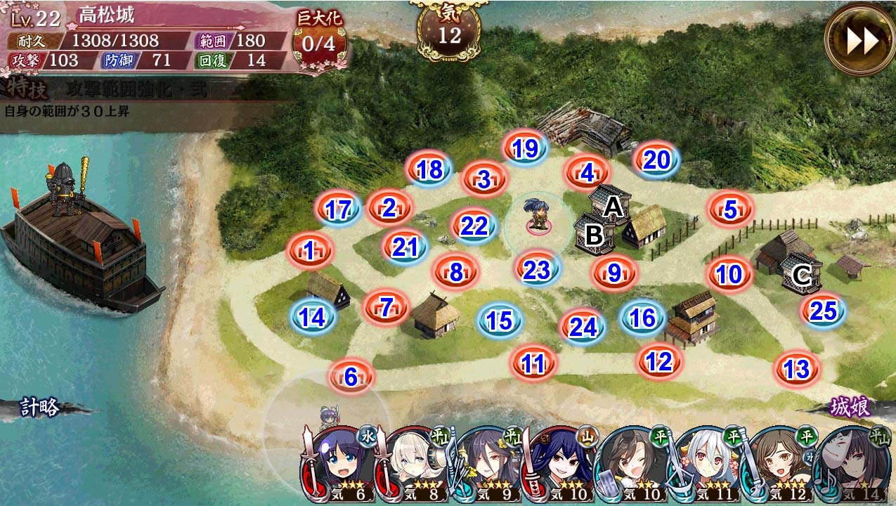 2016年4月5日、難易度が下げられた 大将兜は居ないが、天下統一屈指の難易度を誇るステージ。 殿のナナメ4方向に進攻路があり、それぞれに陣を展開する必要がある。