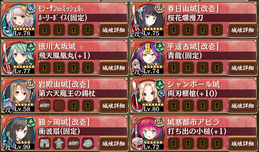 手持ちが近かったので、22春日66桜花・18モンサン69・20山科83・24備中松山68白鷺・15平遥古改76・23シャンボ77両刃・25菩提山改63第六天魔王・17浜田改73(配置場所/城娘名/レベル/装備)で行けた備中松山は計略不使用巨大化なし --