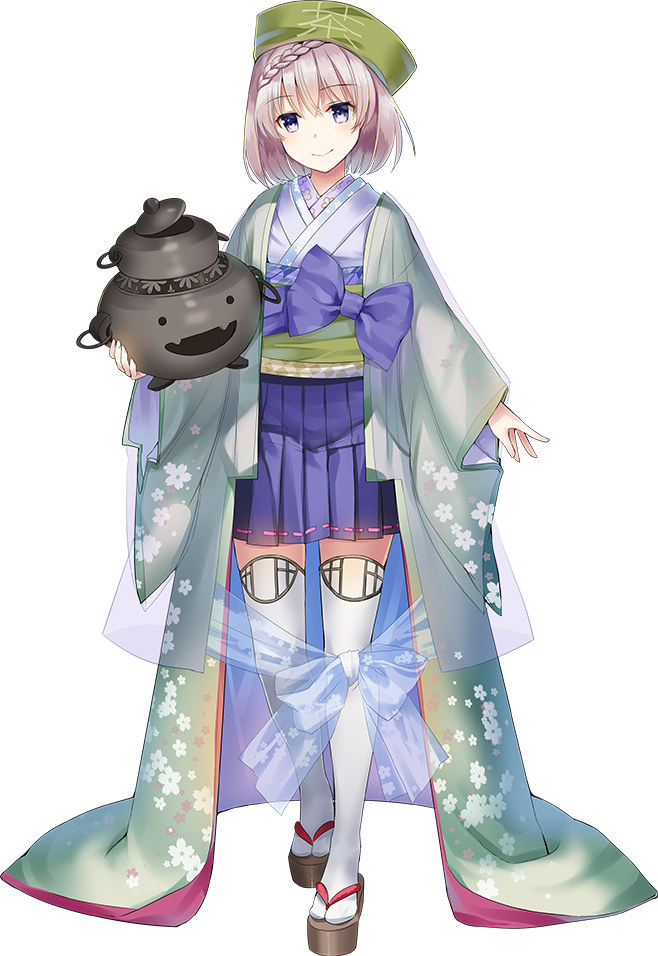 持っている茶釜は松竹さんという名で、モデルは模様から上が茶釜部分で模様と下の部分が「唐銅鬼面風炉」と思われる。