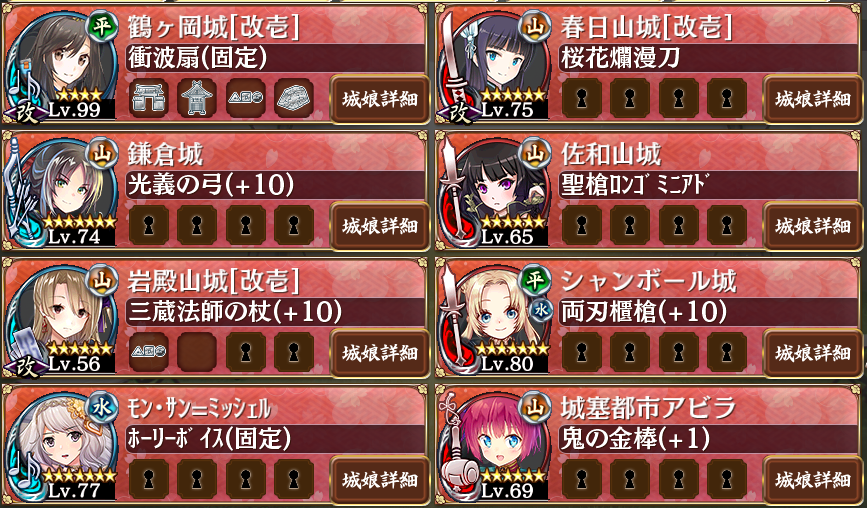 手持ちが近かったので、22春日66桜花・18モンサン69・20山科83・24備中松山68白鷺・15平遥古改76・23シャンボ77両刃・25菩提山改63第六天魔王・17浜田改73(配置場所/城娘名/レベル/装備)で行けた備中松山は計略不使用巨大化なし --