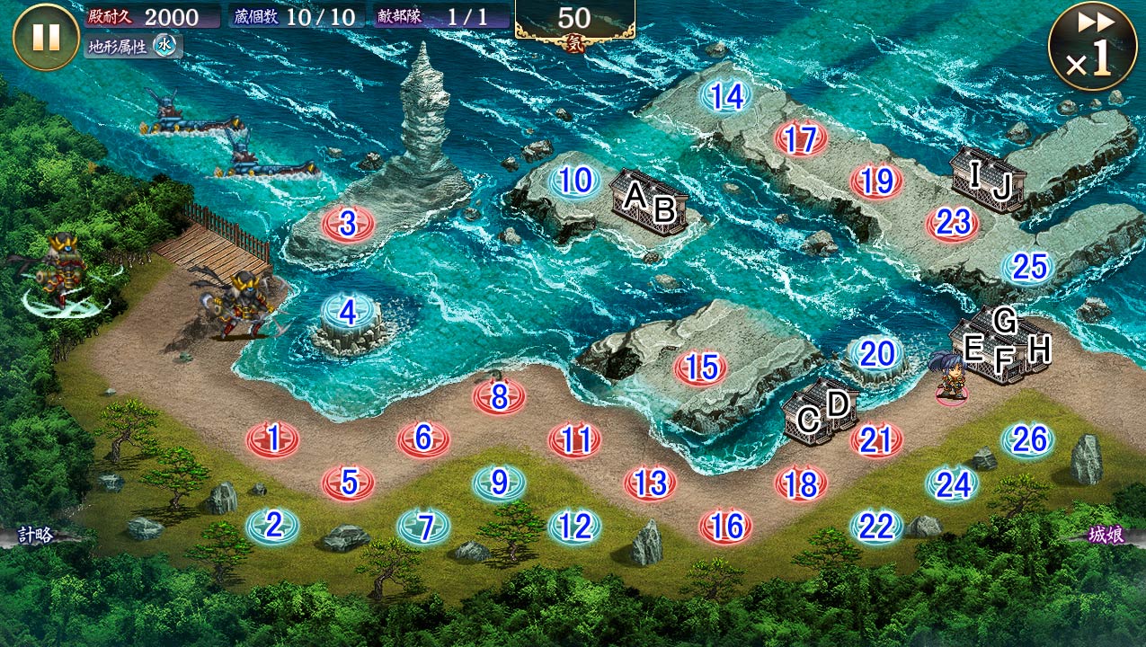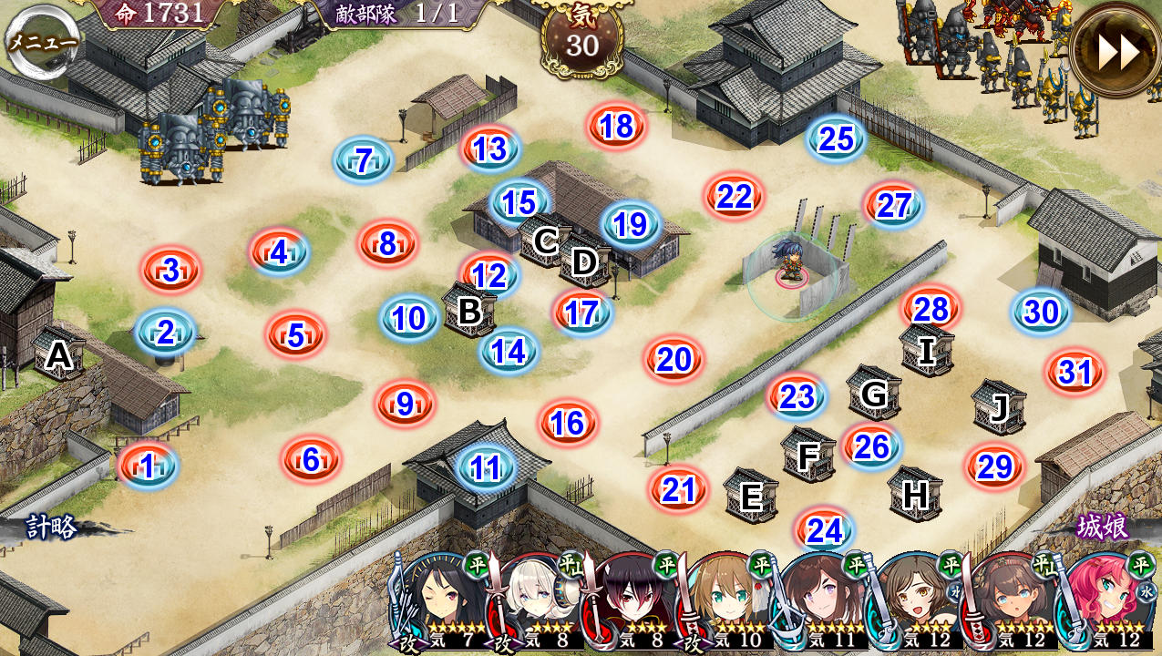 • 猛は鯨の砲撃を9付近にユニットを置いて囮にすることで10の蔵から狙いをそらす、鎖鎌は2に伏兵を置いて対処(猫で良い)あたりが要点でしょうか 一体目鎖鎌撃破後の蝶ラッシュや北東の敵など本がいると楽できる場面が多いです -- 2023-01-27 (金) 02:44:26