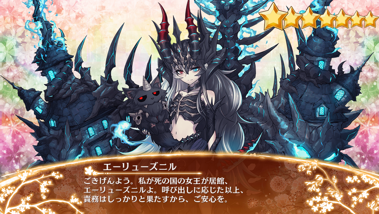 | 1 | 2781 | 170 | 163 | 81 | 0 | 冥界の門番 敵1体を2連続で攻撃 敵の防御を20%無視 攻撃時に耐久が与ダメージの20%回復 |