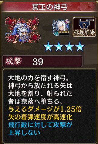 | 4 | 冥王の神弓 | 39 | 与えるダメージが1.25倍 矢の着弾速度が高速化 飛行敵に対して攻撃が上昇しない | 45 | 与えるダメージが1.3倍 矢の着弾速度が高速化 射程+15 飛行敵に対して攻撃が上昇しない | ナラカ初期装備武器限定 大地の力を宿す神弓。神弓から放たれる矢は大地を割り、射られた者は奈落へ堕ちる。 |