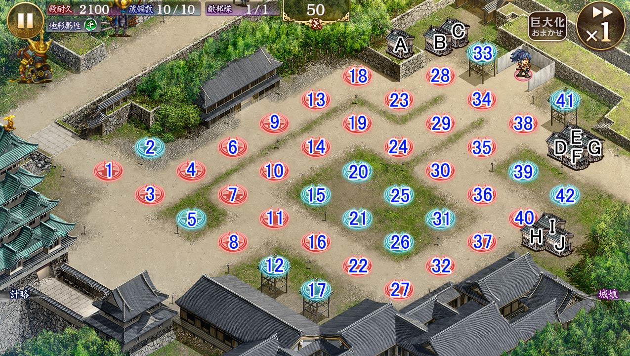 • つべの攻略動画を参考にして配布チケ交換の江戸・彦根&低中レア&竜神像ありで委任解放。5彦根改(槍・Lv93)→2八王子改(槍・Lv87)→20高鍋改(本・Lv82)→18秋田改(弓・Lv85)→17備中松山改(銃・Lv81)→15聖夜龍王改(術・Lv86)→12村尾改(弩・Lv86)まで一気置きして、まず八王子を最大化。泥棒の群れが来たら秋田と村尾を上の道に届くまで巨大化しつつ、すり抜けられそうなら高鍋計略で鈍足化し、19に江戸(刀・Lv96)。泥棒の次の飛行の群れに合わせて秋田最大化し、鍬の群れが下道に迫ってくるので江戸計略点火して巨大化させつつ、落とされない程度に彦根を段階的に巨大化。気トークンの置忘れが無ければここまでギリギリやり繰りできる筈、牛は1→21→23の順で置き、21は足止め囮も兼ねるので壊されたら都度置きなおし。あとは気が溜まる毎に残りを都度巨大化させ、相撲が湧いたら江戸計略。最終ウェーブの蝙蝠の群れに槍二人が削られるので村尾計略を削られてる方の槍に使って耐える。ボス飛行は高鍋と聖夜龍王の計略で足止めしつつ削り、敵が村尾に届くあたりで江戸計略点火。槍二人のレベルをしっかり上げないと最後の蝙蝠に削り殺された。軸の江戸彦根以外は、似た計略持ちでも代替できると思う。 -- 2023-02-08 (水) 20:55:24