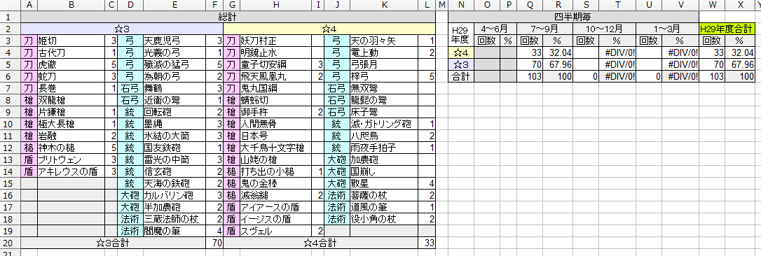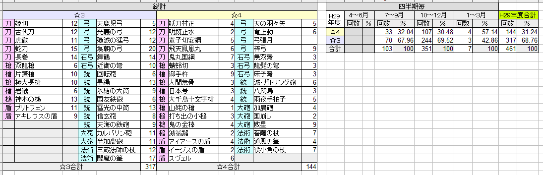 大砲が☆3でもいいから一個欲しくて50回ほど回したけど、一回も落ちなかったよ……。滅ガトとか他の☆4武器が12個ほど落ちたから、まあ良しとしたけど…… --