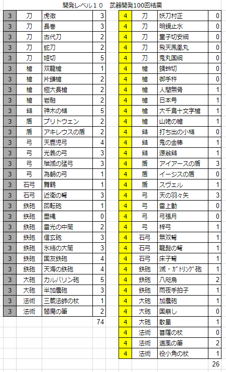 大坂城改築した時に入手したやくも珠で13回武器開発した結果、☆3九個☆4四個の武器を入手、☆4の武器は山姥の槍、妖刀村正、鬼の金棒(new!)、国崩し(new!) --