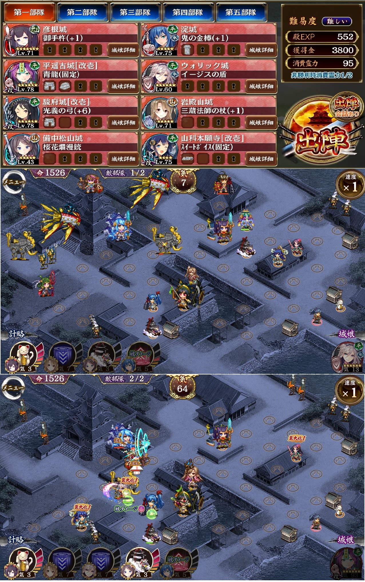 40彦根改42浜松改で計略CT短縮して、43ハロユッセ改のオバケを2~19、9~30のラインに配置。17伏見改に15大垣の計略、竜巻で左上旗を攻撃。18安平改、28五稜郭改、3臼杵改も出世してバフデバフ気生産支援とやったら操作量はともかく苦戦は全くせず楽勝でしたな。あんぴこ出さなくて良かったくらいに。 --