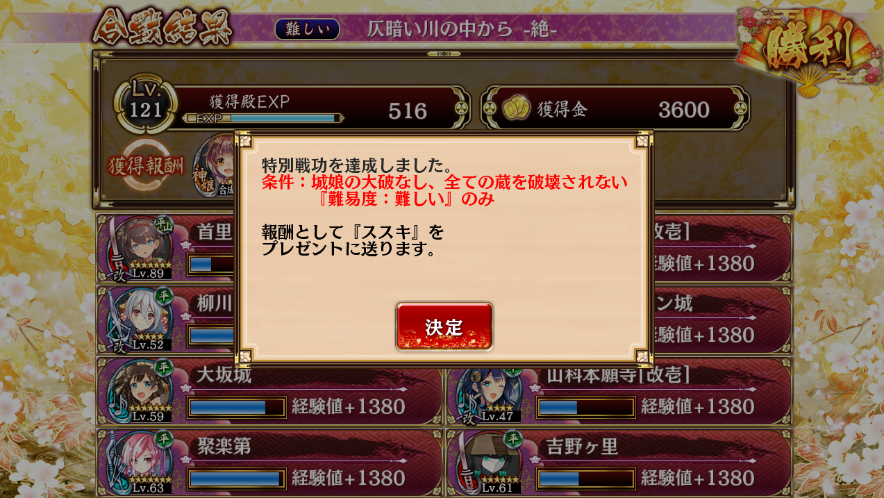 21:柳川改Lv53 24:山科本願寺改Lv41 20:山形改Lv41 10:浦添改Lv48 5:大阪Lv47 6:春日山改Lv55