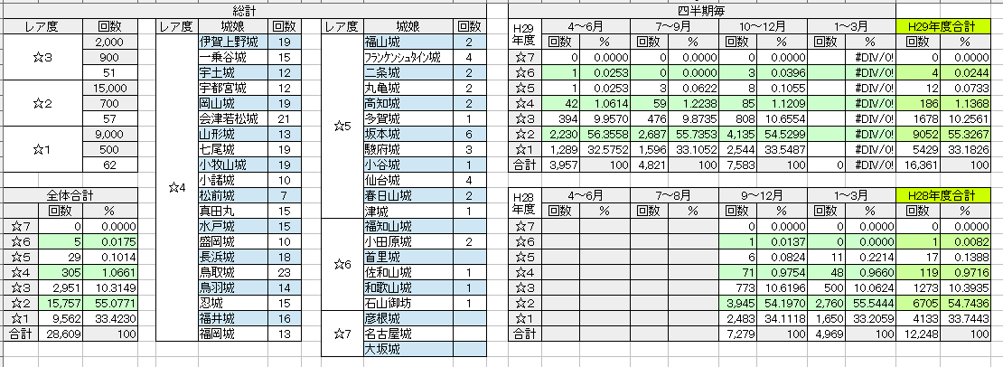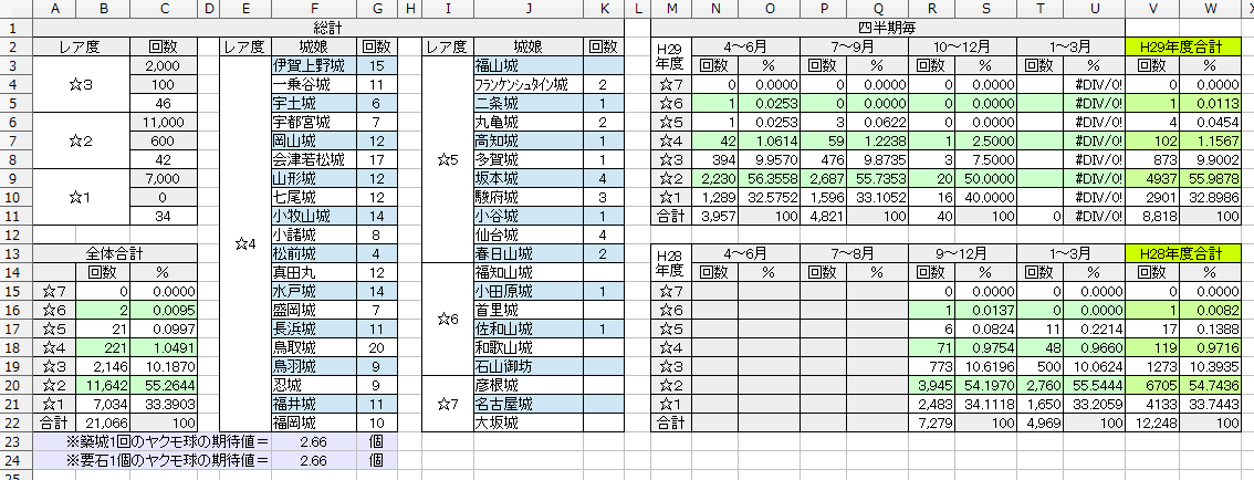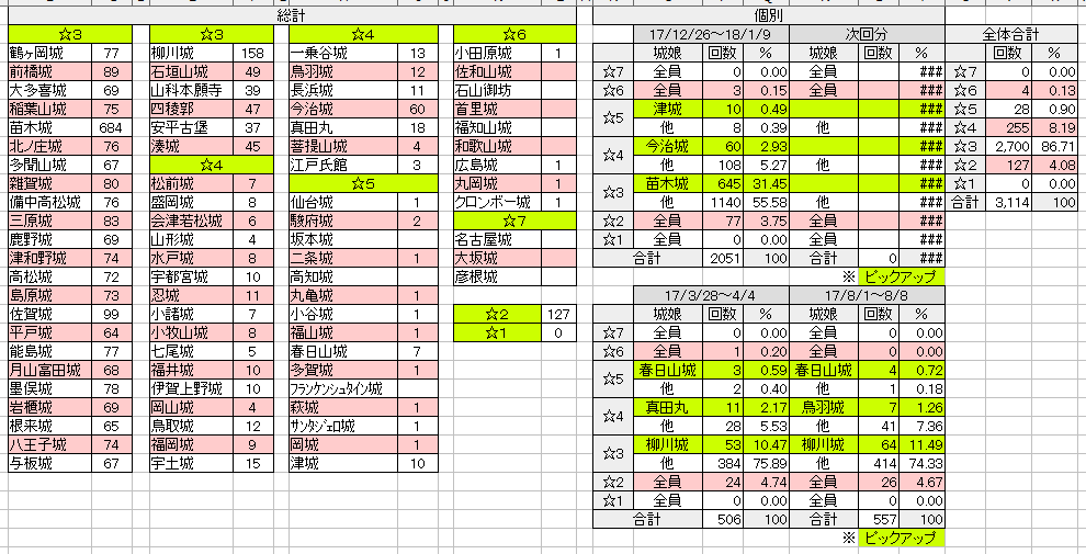 • 築城10からメモ取り始めて、最長のハマりで360回星4以上出てない時あった この付近の通常1000築城の星4以上の確率が0.5%、星3が9.8% 欲しい子が出ればいくらハマっても許せちゃうんだけどね -- 2017-03-20 (月) 13:38:55