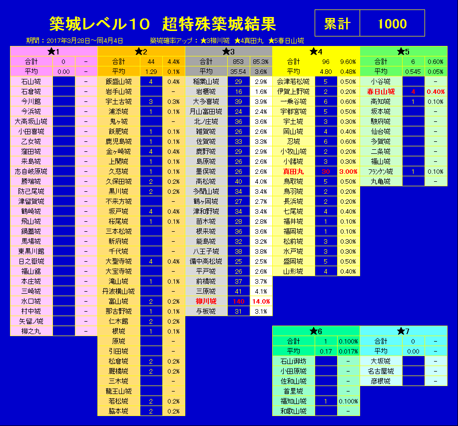 • レア3の城が10倍の確率ならボロボロできるはずなので、柳川はたぶん簡単に出ると思う、今までの報告を見る限り確率10倍ならレア4も10%、レア5が1%くらいになるのじゃないだろうか、もっとも石10個つかうので試行回数が稼げないという点で手に入りにくいのは同じか(苦笑) -- 2017-03-22 (水) 16:07:50