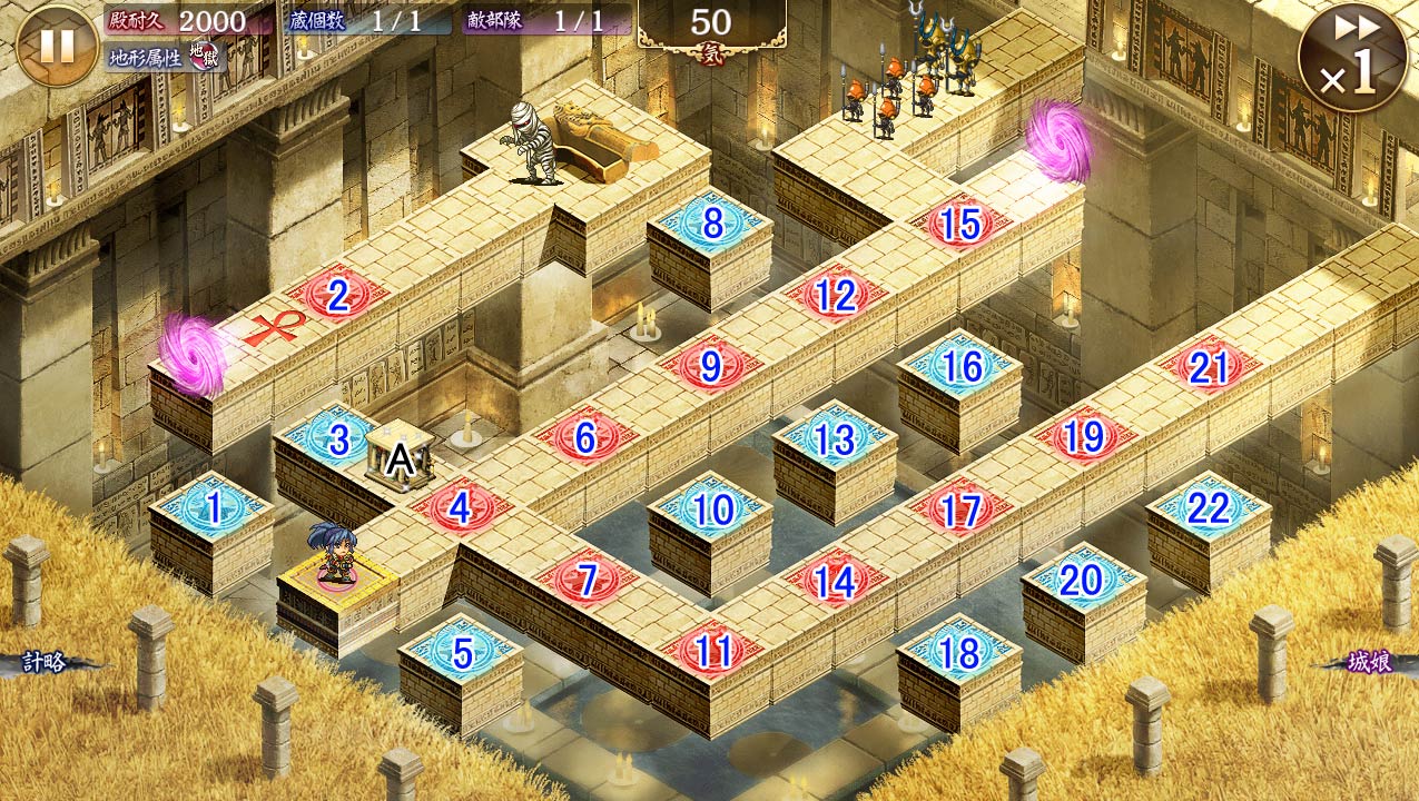 <アンクのヒエログリフ>![]() 地面に記されたアンクのヒエログリフへ到達した敵軍ユニットは、 攻撃が1.5倍、回復が100上昇します。 |