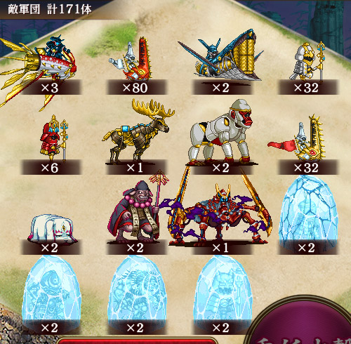 | <特殊な氷柱について> 兜が閉じ込められた氷柱は、氷柱の耐久が0になると中の兜が進軍を開始します。 氷柱の耐久は時間経過で減少し、ダメージを与えることでさらに進軍が早くなります。 ひびの入った氷柱は、防御が0になり、耐久減少速度が大幅に上昇します。 また、中の虚無僧兜は氷柱から出ると、全ての城娘の攻撃と防御を25%低下させます。 |
