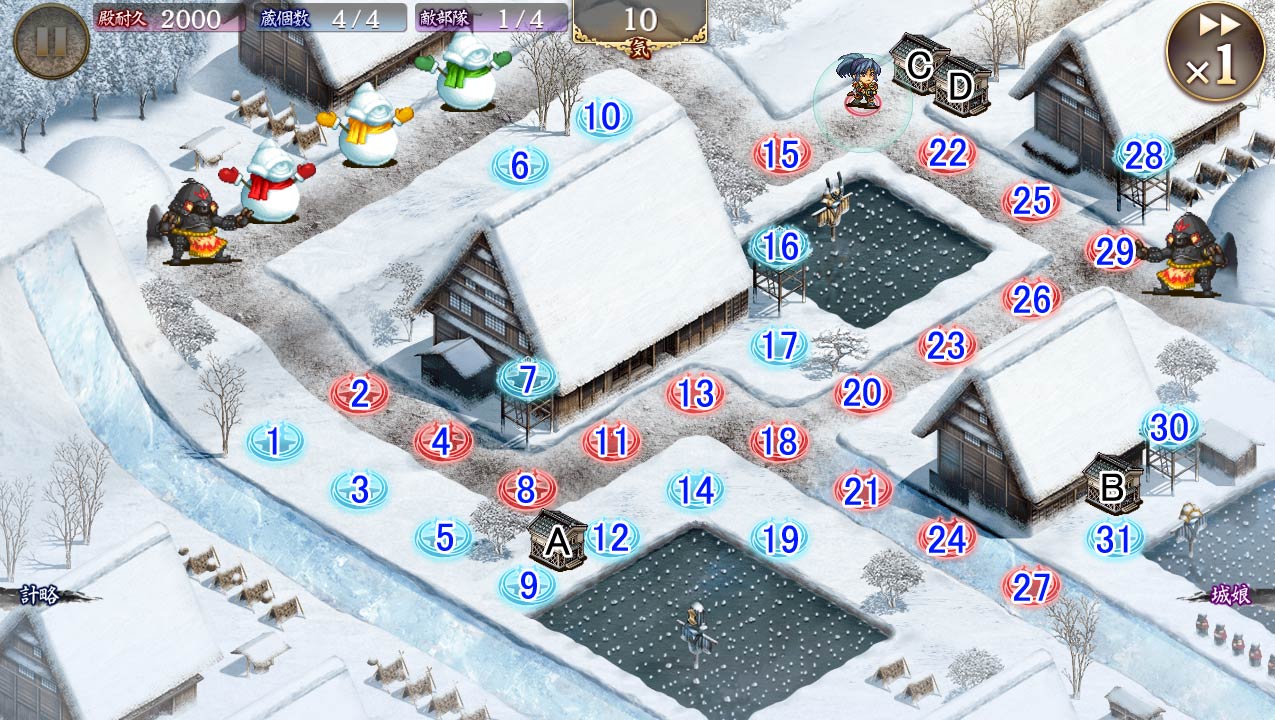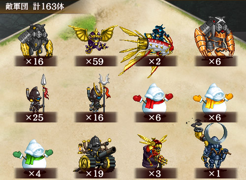 | 今回登場の一部の兜は、砲弾や銃弾の代わりに雪玉で攻撃します。 雪玉で攻撃を受けるとごく僅かな間、行動を封じられます。 また、雪玉で攻撃する兜は射程が上昇する代わりに、攻撃が低下しています。 ※対象の兜:砲撃式トッパイ形兜、強化型蜂形兜、半月形兜 |