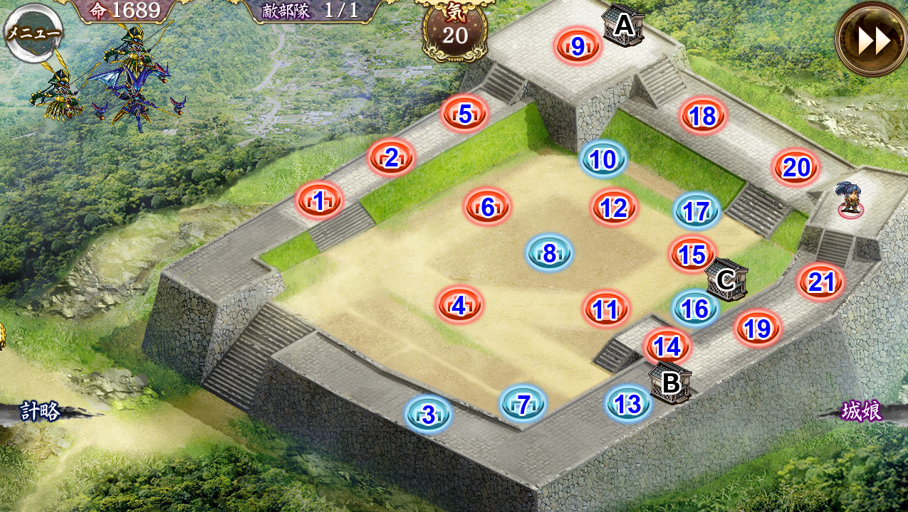 主力は小牧山と弩1人(多賀でいいかな)、丸岡、与板、鹿野は計略メインで巨大化なし、伏見でダメージ軽減、刀2(うち1は最後のデコイ役)。(1)15に鹿野、(2)17に丸岡、(3)8に小牧山、小牧山3回巨大化、(4)16に気増やす奴、(5)小牧山最大化(目安、最大化時攻撃力300あって、与板城{LV不問}いたら余裕でクリアできる)、最初の熊集団が全部10を通過したら、(6)10に伏見、熊が12を通過したら、(7)12に与板(いなかったら他の攻撃力上昇計略持ちで代用)、(8)伏見1回巨大化、7に多賀、熊第2弾の先頭2匹が6を通過したら、(9)2に丸岡の蛇、(10)9にふくっち、伏見2回目の巨大化、多賀体力減ったら巨大化で3段階あげる、小牧山に攻撃力アップの計略、(11)多賀最大化、伏見4回目まで巨大化、弓と熊の大群が来たら (12)11に蛇、小牧山に2回目の攻撃力アップ計略ができ次第すぐつける、(13)蒲生が動き出したら伏見の竜巻で回復の時間稼ぎ、(ここまで上手くいけば、残りは蒲生と熊6体、小牧山は体力3/4あれば弓一回耐えるし、与板も体力フルなら一回耐える)、(14)11にくまもん、弓をもらったら巨大化、最後は6に蛇おけばクリア --