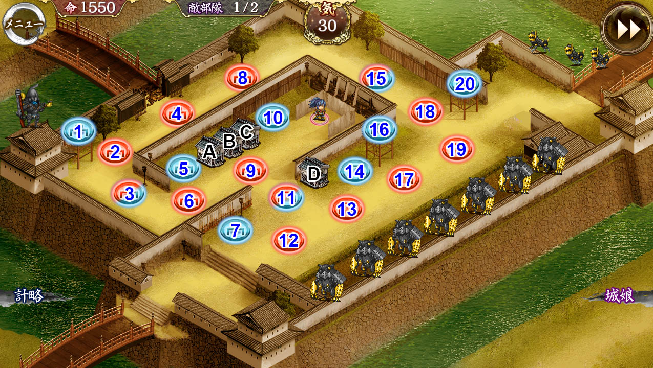 6人編成、5に氏郷対策、11に周辺制圧、14、16にD蔵右方面防御、10に回復役、4に氏郷デコイ。殲滅力が足りないとABCが殴られるので、16より9の方が良いかも。 --