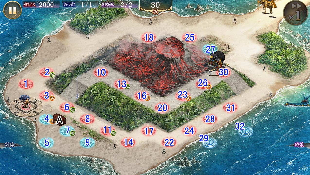 | 今回の合戦では、一定時間経過後に特定の配置場所が溶岩地帯となります。 溶岩地帯になると配置マス効果が消滅し、 配置されている殿側ユニットは最大耐久の3%の継続ダメージを受けます。 |