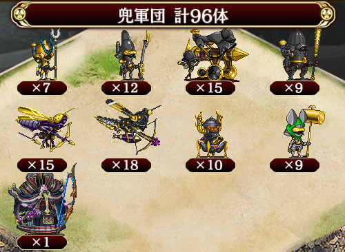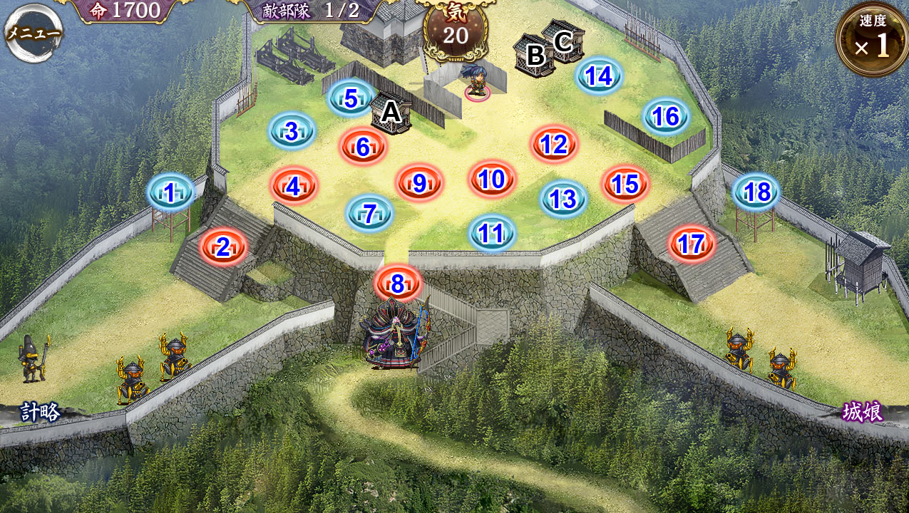 。1wで1と18の弓を最大化、ストーブは7と16札で。2wで8槍を置くと元就と破城槌4体がずれて少し楽になる、気がする。元就が来る頃には気が余るので巨大化回復しながら倒す。 --