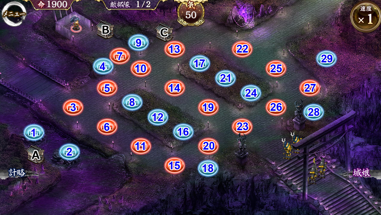 配置順は27→9→4→8→17→10→13→2。鹿野配置後2回巨大化、2wに気トークン設置したら撤退、7に再配置。弓二人を最大化し天狗を処理したら坂戸まで配置、坂戸最大化。後は残りの面子を配置し歌舞を最大化したら後は流れで。 --