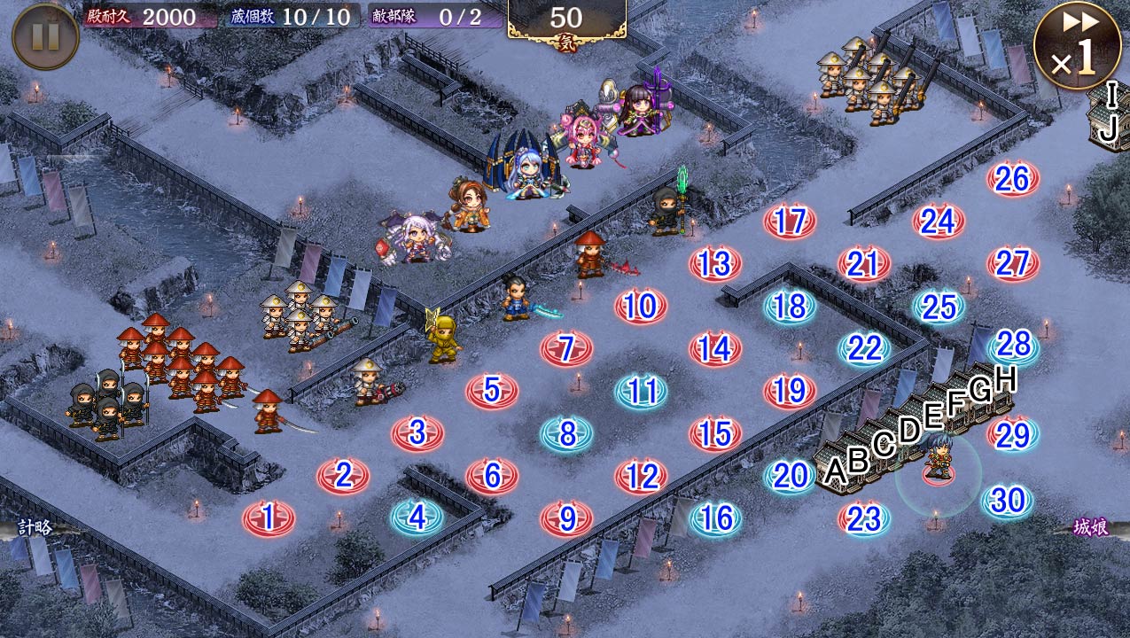 | 今回登場の敵城娘は、それぞれ自身の特技、計略効果のうつ以下が発動しています。 栗橋城:自身の攻撃速度が20%上昇、射程内の敵の攻撃速度を15%低下。 平井城:自身の射程が20上昇、攻撃を受けた時、攻撃の45%で反撃。 伊豆下田城:自身の防御が30%上昇、単発攻撃を行い、攻撃の3倍のダメージを与える。 |