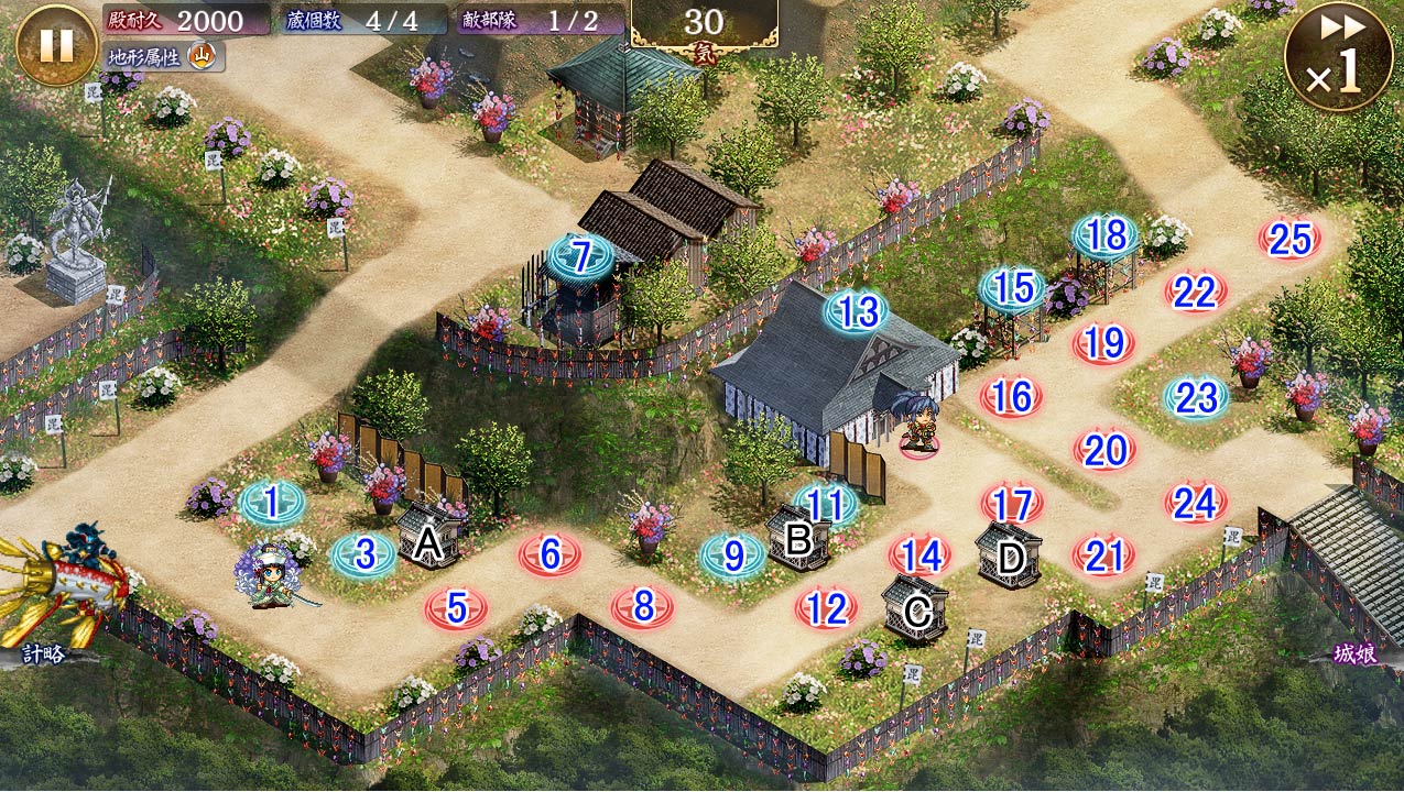 | 白無垢衣装の間諜兜は足止めや後退効果を受けずに、殿の元に向かいます。 また、道中の城娘や伏兵、蔵には攻撃せず、攻撃範囲に捉えた殿を一撃で倒します。 |